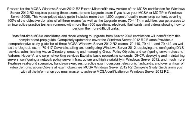 Many server admins are now going for the Winserver 16 cert but if you are going for the 12 exam I highly recommend reading the MCSA Windows Server 12 R2 Complete Study Guide. Administering Windows Server 12 R2 exam 70-411 MCSA:. Mcsa Windows Server 12 R2 Complete Study Guide available for download and read online in o.